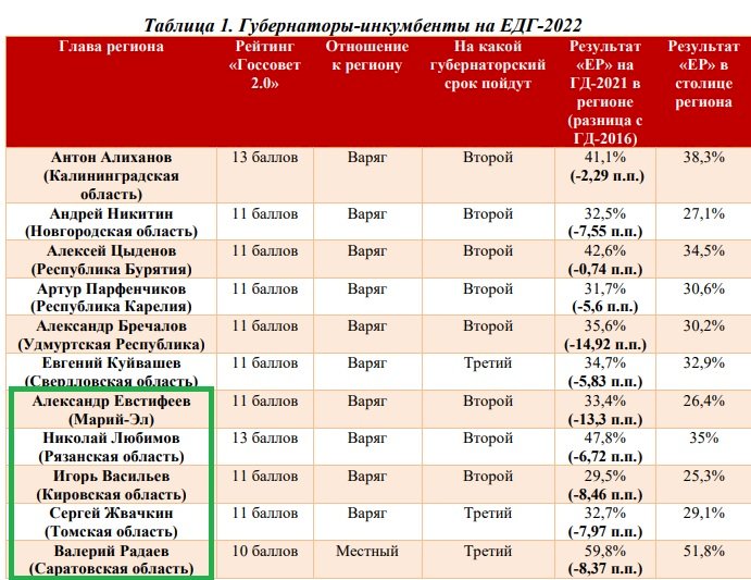 Также Кынев обращает внимание, что пять отставников имели разный послужной список и причины для ухода: «У Васильева и Евстифеева катастрофические результаты выборов в сентябре 2021, плюс у Васильева ещё и коррупционные скандалы в администрации. Любимов реально почти не руководил, всё решали замы. Жвачкин явно не очень стремился, хотя был неплохой по общим меркам губернатор со стабильной командой, точно не самодур. У Радаева высокий антирейтинг, а в сентябре ещё и выборы облдумы. Так что причины у всех свои, общее — что ротацию затянули. Спецоперация к отставкам не имеет отношения и это не демарш», — отмечает эксперт.