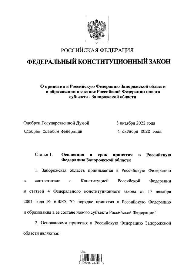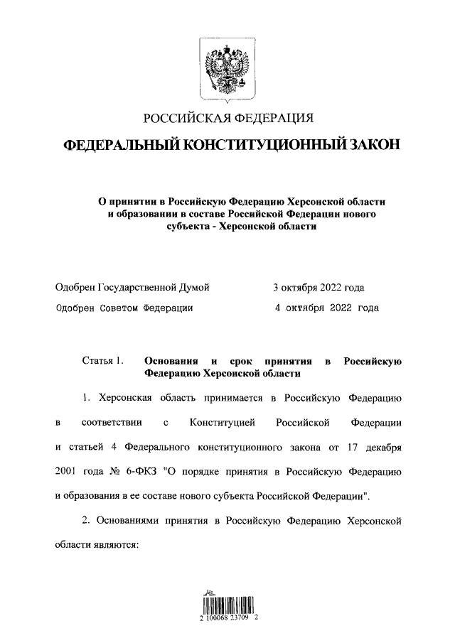 Напомним, на референдумах подавляющее большинство жителей ДНР, ЛНР, Запорожья и Херсонщины проголосовали за вхождение в состав России. 3 октября Госдума ратифицировала договоры о вхождении новых территорий в состав РФ. 4 октября Совфед единогласно одобрил договоры о вхождении четырёх регионов.