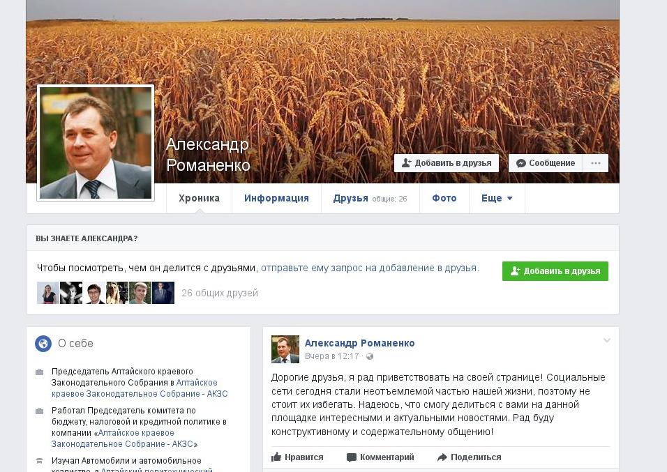 Председатель Алтайского Заксобрания, лидер регионального отделения партии "Единая Россия" Александр Романенко завел свою страницу в Facebook.