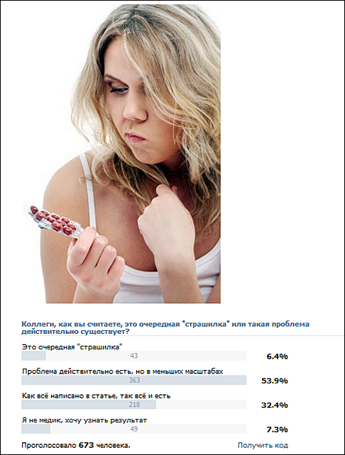 А что думают по этому поводу российские практикующие врачи, которые непосредственно в процессе лечения пациентов наблюдают, насколько эффективно работают те или иные антибитики? Эксперты из группы "Доктор на работе" в Вконтакте (http://vk.com/wall-25201586_64506) в своем большинстве (53,9%) считают, что "проблема действительно есть, но в меньших масштабах". Им вторит 32,4% респондентов: "Как всё написано в статье, так всё и есть!", и только 6,4% из более чем шестисот участников опроса не отнеслись в информации как к пугающему предупреждению, а посчитали очередной "страшилкой" от кабинетных ученых и теоретиков.