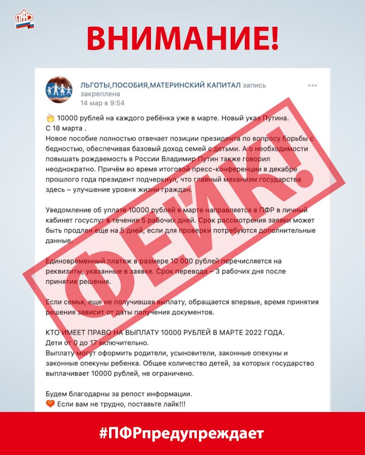 Информация об этом появилась в многочисленных сообществах в соцсетях, посвящённых выплатам и мерам поддержки от государства. Согласно данным этих пабликов, деньги якобы должны были начать перечислять с 18 марта. При этом 10 тысяч рублей положены каждому ребёнку от 0 до 17 лет, утверждали авторы сообщения.