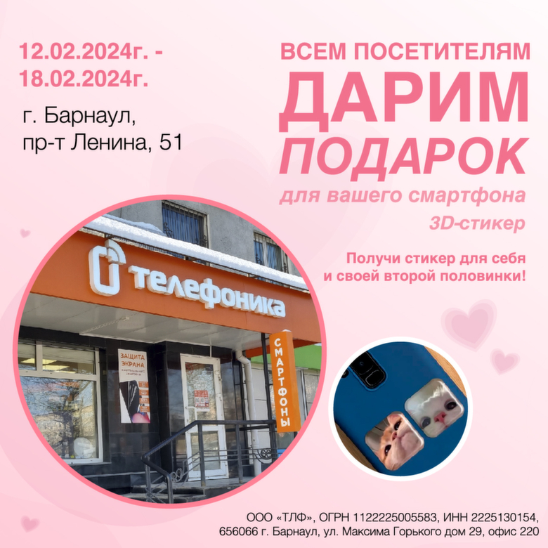 Магазины смартфонов и гаджетов "Телефоника" поздравляют жителей Барнаула с Днем всех влюбленных и дарят 3D*-стикеры всем посетителям магазина по адресу проспект Ленина, 51. С 14 по 18 февраля 2024 года здесь можно бесплатно забрать 3D-стикеры для себя и второй половинки. Их можно наклеить на смартфон, ноутбук, планшет или любой другой гаджет.