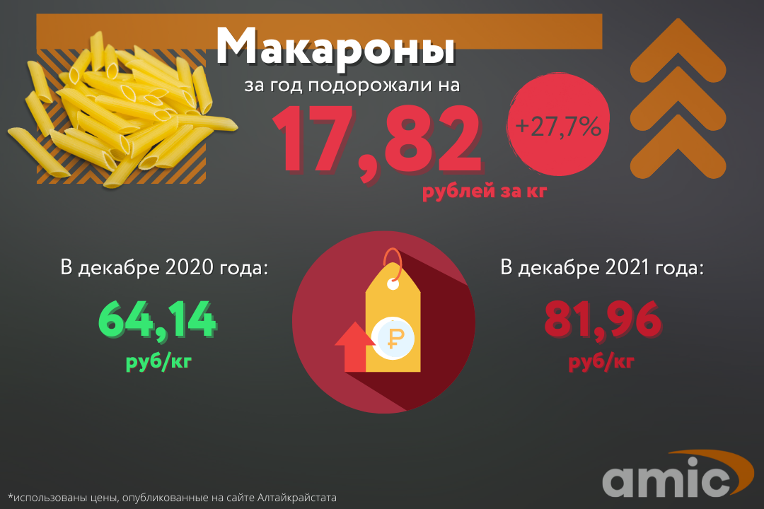 Когда ценами на макароны возмущался Владимир Путин (в декабре 2020 года), один килограмм на Алтае в среднем стоил около 64 рублей. Интересно, что он скажет во время пресс-конференции в этот раз (а она уже совсем скоро) – за 12 месяцев продукт стал дороже на 27%. В декабре 2021 года за тот же килограмм макарон мы платим в среднем около 82 рублей.