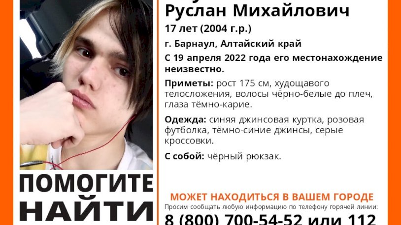 Приметы: рост 175 см, карие глаза, нормальное телосложение, чёрно-белые волосы до плеч. Был одет в синюю джинсовую куртку, розовую футболку, тёмно-синие джинсы и серые кроссовки. С собой носил чёрный рюкзак. Всех, кто видел молодого человека или знает, где он находится, просят сообщить по телефонам 112 и 8-800-700-54-52.