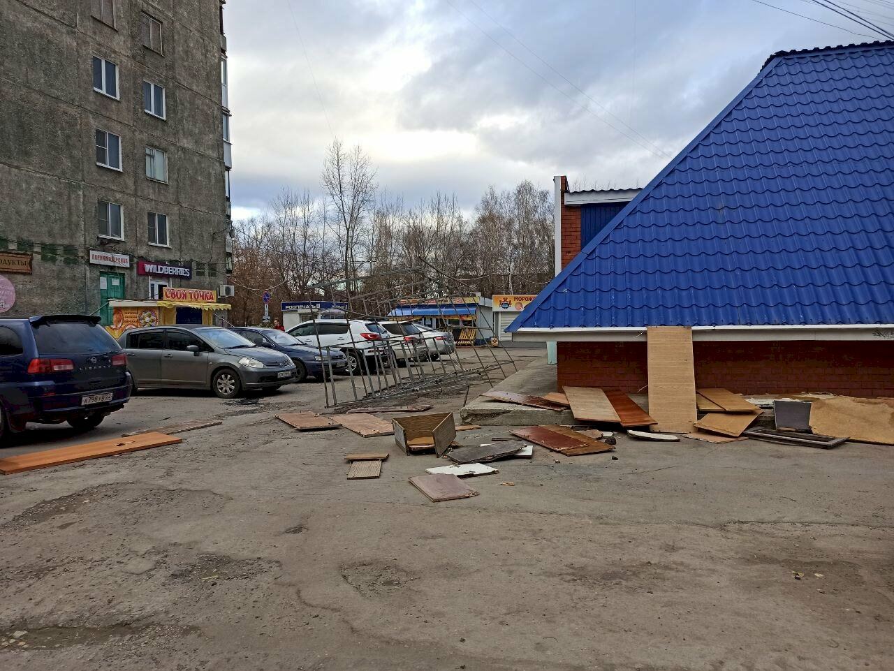 «Вот где доски валяются у фасада, там стоял этот остов. И его как-то на угол завернуло ветром. Доски у машин лежат, может, тоже есть повреждения, но пока возмущённых водителей не видно», — рассказал корреспондент amic.ru.