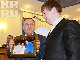 Кроме сертификата, Александр Карлин вручил Нифонтову статуэтку "ОДА" (Олимпийская Доблесть Алтая) - колесница, запряженная лошадьми. Впрочем, Нифонтов не остался в долгу и подарил губернатору свое фото, где он запечатлен рядом с премьер-министром Путиным.