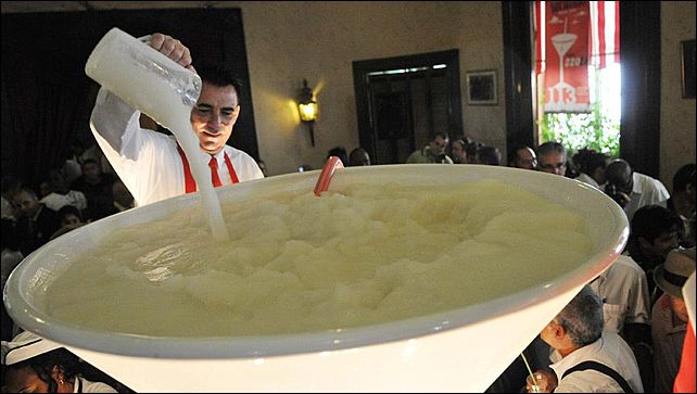 В прошедшие выходные во всемирно известном кубинском ресторане "Флоридита", который в нынешнем году отмечает 195-летие со дня основания, приготовили самый большой в мире коктейль "дайкири". Для того, чтобы сделать порцию фирменного напитка объемом 275 литров, двенадцати барменам понадобилось 33 минуты и 88 бутылок белого рома, а также огромное количество