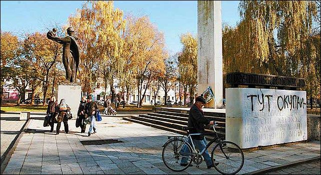 Тут дело, можно сказать, привычное: на майдане Рынок, не так давно носившей название площадь Победы, – памятник советским воинам, испещрен и свастикой, и скабрезными надписями. Но чаще всего пишут про "москалей".