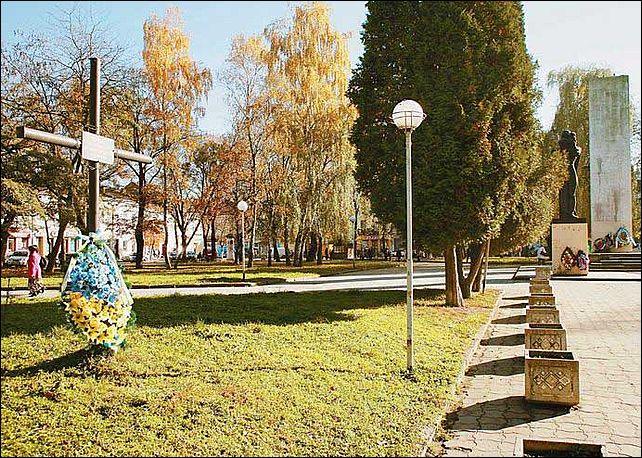 Рядом с бывшей площадью Победы – просто на газоне – возвышается черный крест в честь УПА.