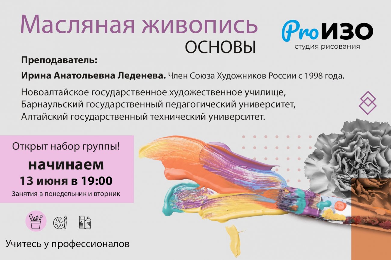 Вести «Основы масляной живописи» будет Ирина Леденева, член Союза Художников России, преподаватель более чем с 30-летним опытом. Так, с 1983 она работала в НГХУ (Новоалтайское государственное художественное училище), преподавала в Барнаульском государственном педагогическом университете, а также в АлтГТУ.