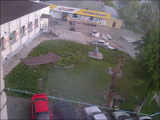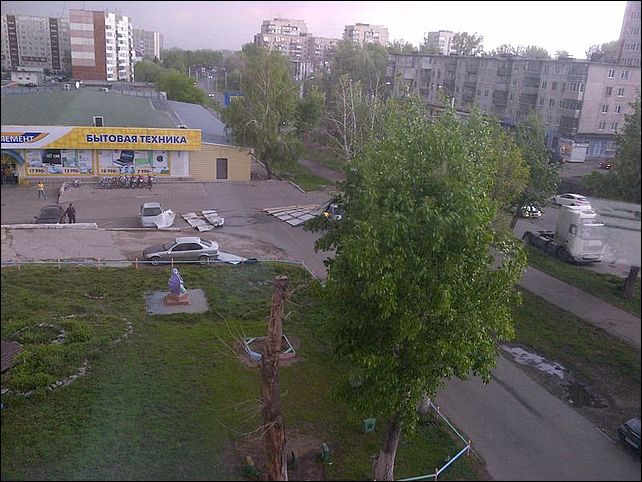 "Антона Петрова, 204, шифер сорвало с крыши! За полсекунды до этого на месте разбитого шифера шла моя дочка... Бог уберег от трагедии! Осколки шифера отлетели в припаркованную машину (на фото машина уже отогнана на безопасное расстояние). Надеюсь, звонок в администрацию и заявление в милицию помогут укрепить крыши домов)".
