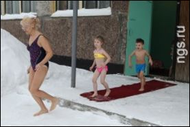Сейчас в "Родничке" 50 моржей. Ежедневно после утренней зарядки дети раздеваются и бегут во двор, чтобы вылить на себя ведерко с ледяной водой. В общей сложности они проводят на морозе не более 2–3 минут. А затем бегут греться в теплый душ.