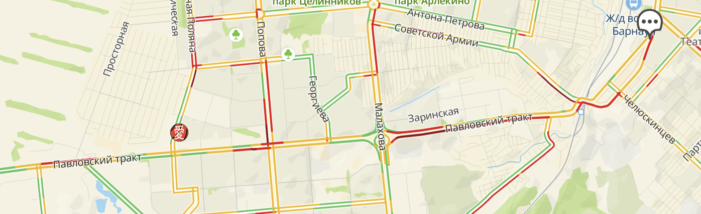 На Павловском тракте пробки собрались в районе пересечений с Трактовой, Власихинской и Попова, а самый длинный затор растянулся от Малахова до перекрестка с Фурманова.