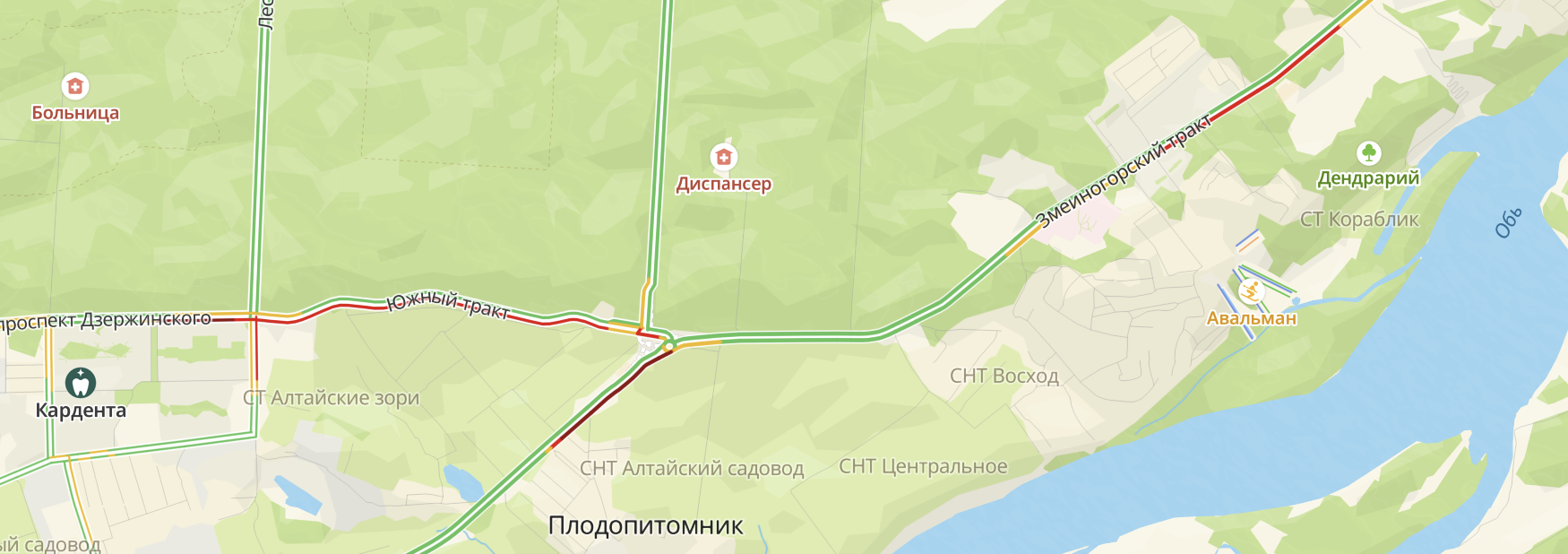 Уже привычные для водителей пробки – в районе строительства будущей развязки на пересечении этих трактов. На Змеиногорском пробка также собралась от 6-й Нагорной до Горнолыжной.