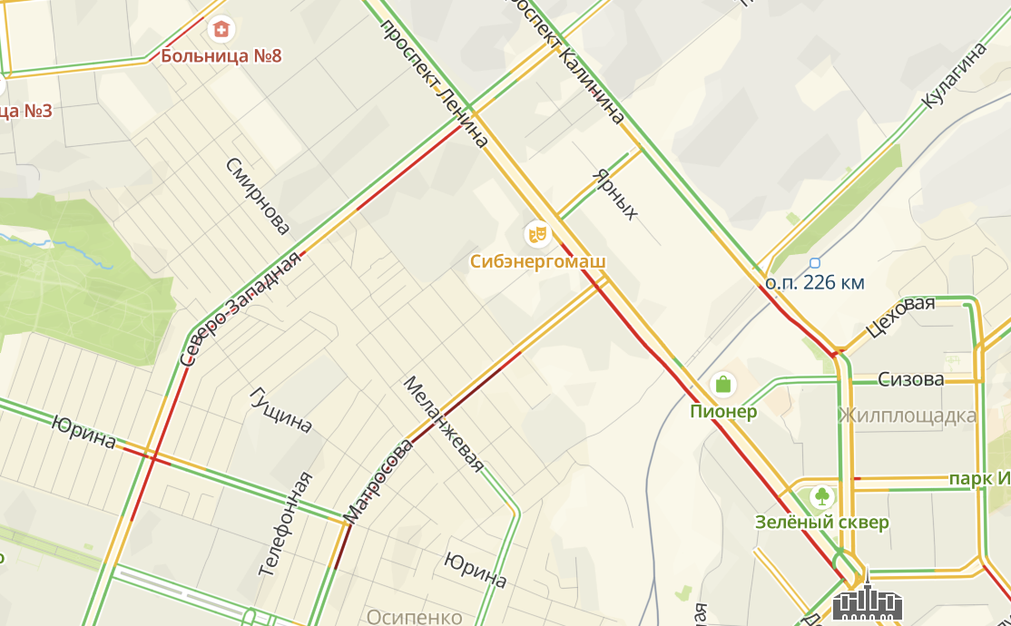 На главной улице города большая пробка начинается от ДК "Сибэнергомаш" и тянется до площади Октября. На прилегающих к проспекту улицах Матросова и Северо-Западной также отмечаются крупные заторы.
