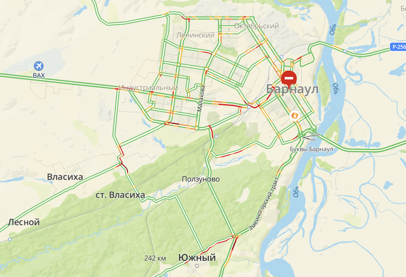 Змеиногорский тракт. Проезд затруднен от Плодопитомника до строящейся развязки. В сторону этого же объекта пробка наблюдается на Южном тракте.