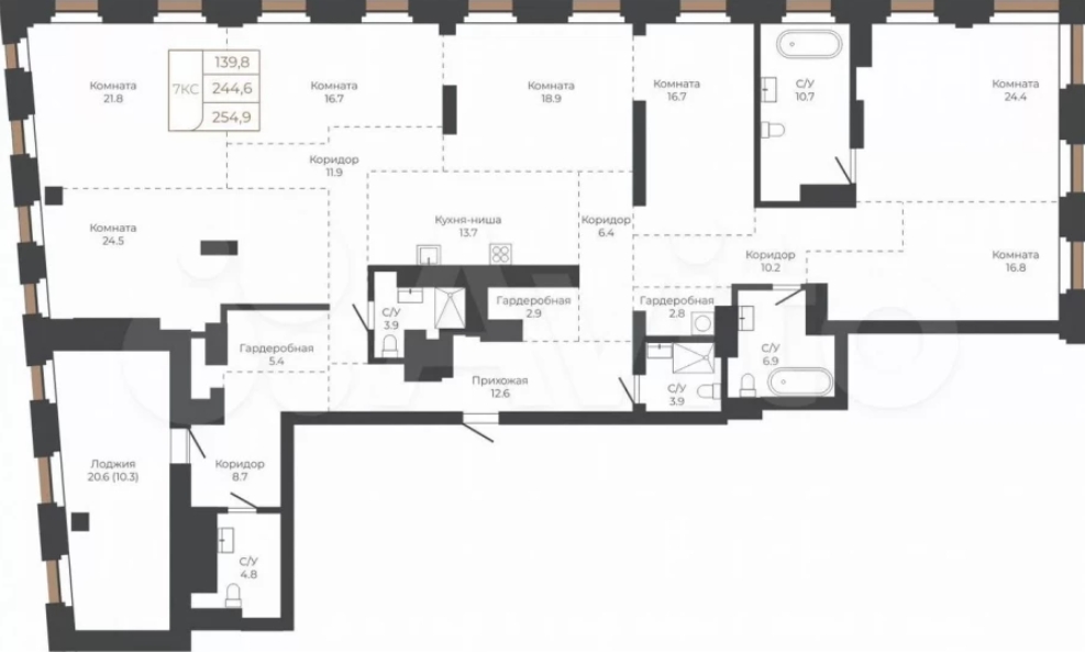 Самая дорогая квартира в этом комплексе находится на 26-м этаже одной из башен. Всего в домах будет по 27 этажей, так что будущим владельцам достанется почти панорамный уровень. Площадь жилья — 253 квадратных метра, потолки — 3,5 метра. Окна выходят на улицу, санузел заявлен как совмещенный.