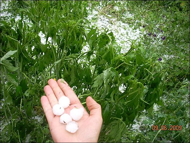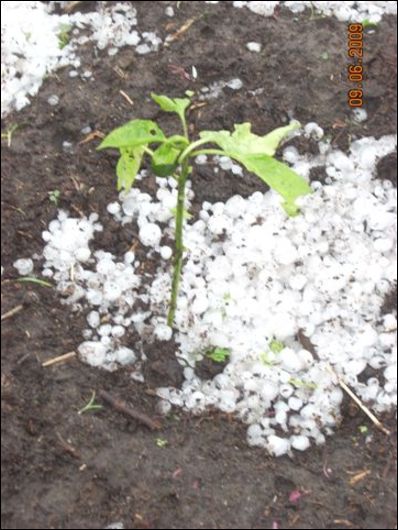 "В Учхозе сильный град шел около 40 минут (с 17-40 до 18-30). Сразу налетел шквалистый ветер, а потом начался просто кошмар. Градины сыпались размером с перепилиные яйца. Похлестало все: там где были помидоры, картофель, перцы, виктория - остались только поломанные голые палки. Земля, как после бомбежки - окопы, траншеи, ямы. Окна в доме трещали. Сигнализации машин вокруг кричали. В огород страшно выйти", - делится пережитым Людмила Ерохина.