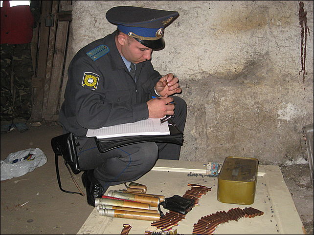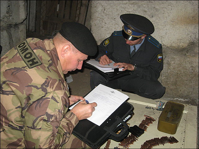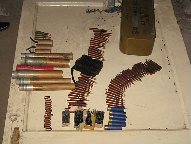 В ходе осмотра места происшествия сотрудники полиции обнаружили и изъяли более 500 шт. боевых патронов (часть из которых была упакована в цинк заводским способом, другие хранились россыпью). Кроме этого, были изъяты охотничьи патроны для гладкоствольного оружия, охотничьи винтовочные патроны, мелкокалиберные патроны для спортивного оружия, взрывные пакеты и сигнальные ракеты.