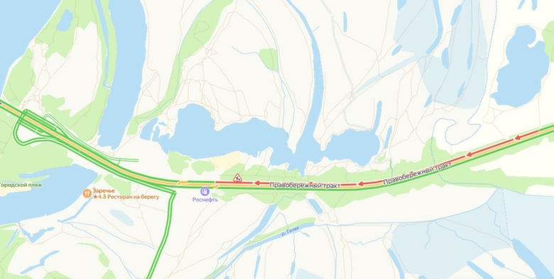 Судя по данным сервиса "Яндекс.Пробки", работы ведутся по правой полосе Правобережного тракта.