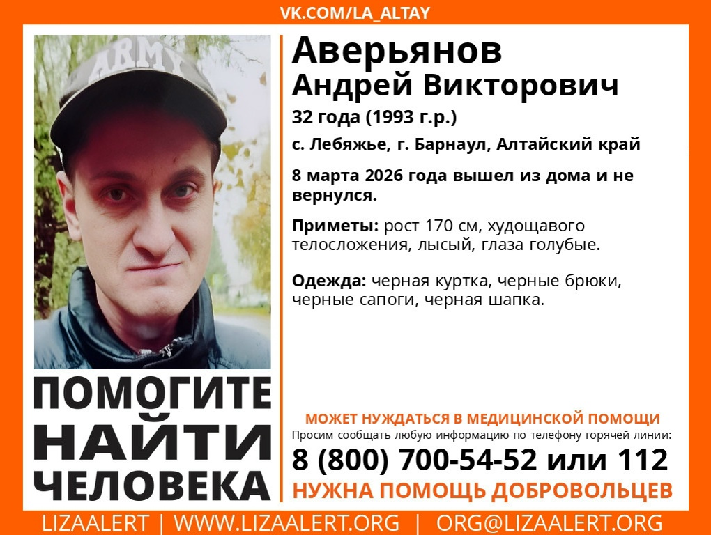 В Барнауле пропал 32-летний Аверьянов Андрей Викторович. О его местоположении неизвестно с 8 марта, сообщает поисковый отряд "ЛизаАлерт".