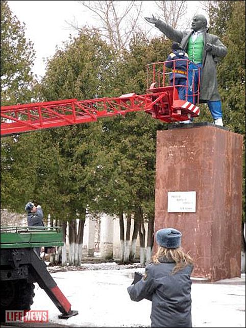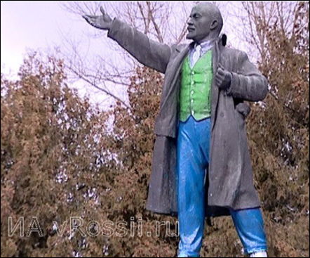 В частности, рубашка и обувь были окрашены в белый цвет, брюки - в синий, жилетка - в зеленый, а сам постамент выкрашен в красный