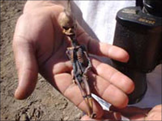Ну, а что же мумия? Имена ее владельцев и обстоятельства находки держат в секрете. Известно лишь, что "инопланетянина" нашли на заброшенной свалке в поселке Ла Нориа Позо, находящегося в 100 километрах от чилийского города Икике. Мумия была завернута в тряпочку и перевязана красной лентой.