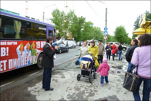 На остановках, где отмечалось большое скопление людей, активисты КПРФ выходили и раздавали партийную печать, приглашали через мегафон проехать на праздничном автобусе, кричали речевки, поздравляли горожан с Днем Пионерии. По ходу движения автобуса коммунисты также обращались к жителям города через мегафон: поздравляли с праздником, выкрикивали речевки, пионерский лозунг "Будь готов!". Большинство горожан с улыбкой отзывались: "Всегда готов!", привычным жестом вскидывали правую руку у лица наперевес. Другие просто махали рукой вслед "говорящему" автобусу. Многие автомобилисты приветственно сигналили.