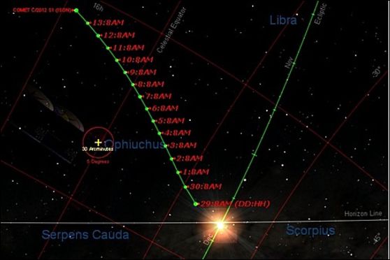 В августе 2013 года комету можно будет наблюдать в телескопы. А уже с октября – в бинокли. Невооруженным глазом комета станет видна в ноябре, а ближе всего к Земле она подлетит 26-29 ноября. Причем во время минимального сближения с Солнцем она может иметь светимость, сравнимую со светимостью полной Луны, а по некоторым данным – даже превосходящую лунную. Это значит, что комета будет видна даже днем.