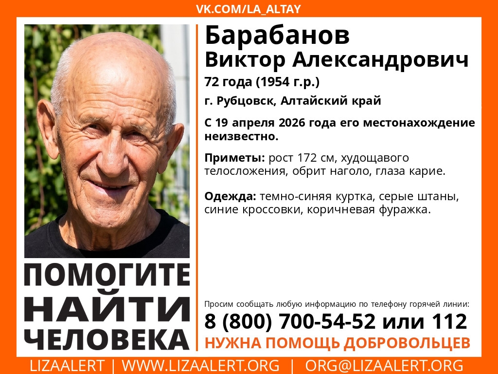 В Рубцовске пропал 72-летний Барабанов Виктор Александрович. О его местоположении неизвестно с 19 апреля, сообщает поисковый отряд "ЛизаАлерт".