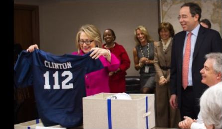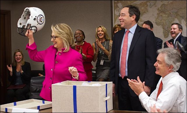 Начальницу собравшиеся встретили овациями. Найдс преподнес ей общий подарок: форму игрока в американский футбол. При этом он заявил, что и дипломатия - это тоже "контактный спорт". Шлем для защиты головы со специальными прокладками говорил сам за себя. Что касается футболки, на спине вышита фамилия хозяйки - Клинтон, а на груди - номер 112. Он символизирует число стран мира, которые руководительница американской дипломатии уже