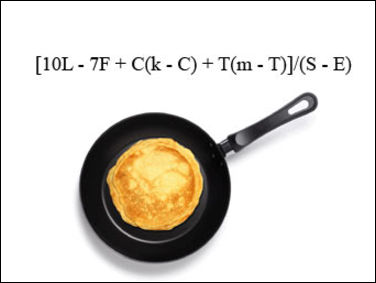 Самой важной, по словам Фэйрклоу, является температура сковороды, обозначенная переменной T. Идеальная температура сковороды принимается за m, а переменная S означает время, в течение которого жидкое тесто стоит перед началом процесса выпекания блинов. E - это время, в течение которого выпеченный блин остывает перед употреблением в пищу.
