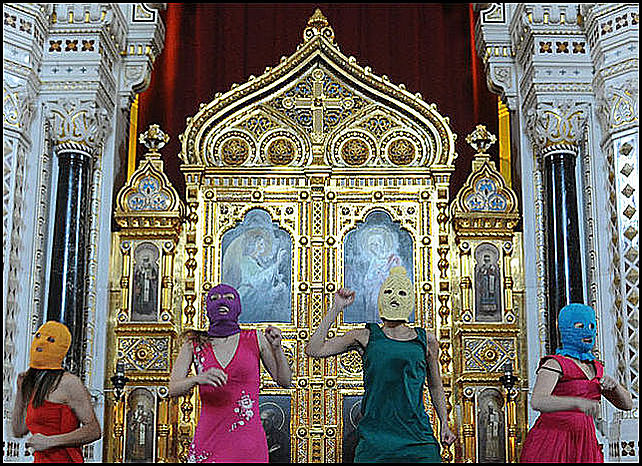 В конце февраля в Сети появился видеоролик "панк-молебен "Богородица, Путина прогони!", на котором несколько человек в женских одеждах и масках совершают несколько необычные танцевальные па перед алтарем в храме Христа Спасителя под соответствующий аккомпанемент. "Все действо продлилось не дольше пяти минут. К ним подбежали охранники и просто выгнали из храма. Никого не задерживали", – рассказывал газете ВЗГЛЯД свидетель произошедшего Александр Кашин.