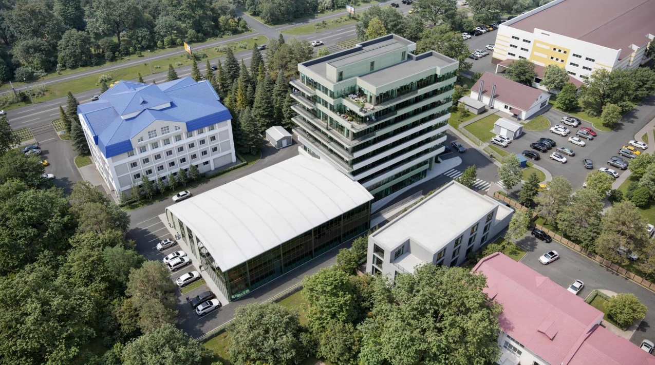 Офисный центр будет состоять из двух блоков. Первый – многоэтажный объем, в котором разместятся административные и торговые помещения. Второй – спортивная "пристройка" с универсальным спортивным залом (можно использовать для тенниса), площадками для игр в волейбол, баскетбол, для гимнастики.