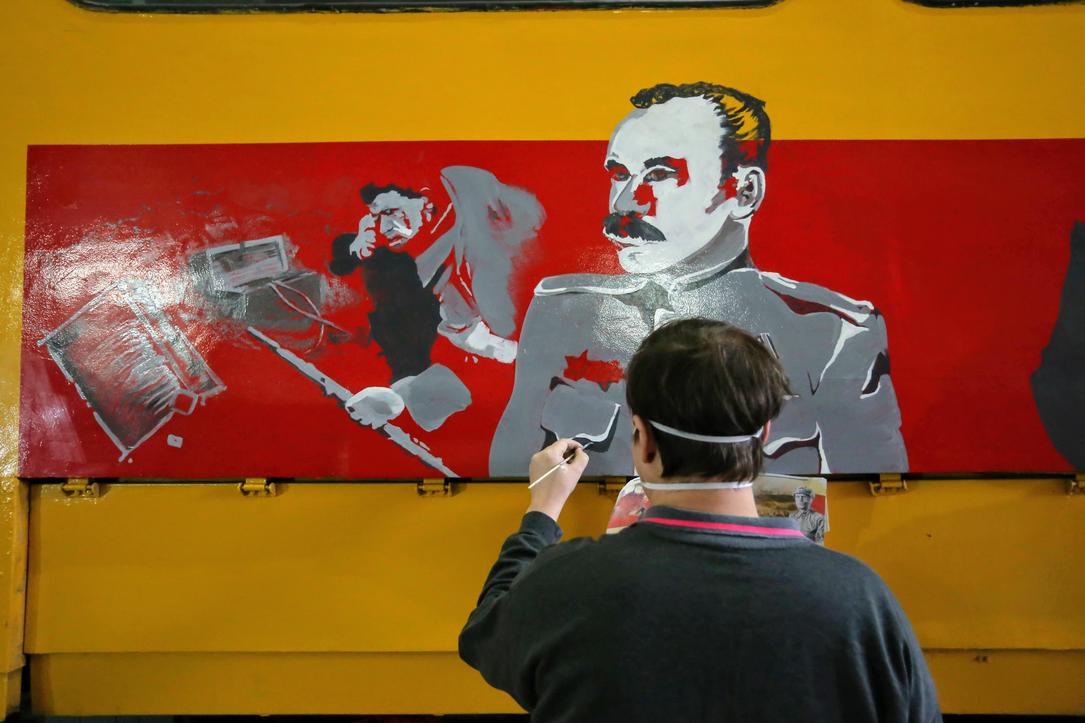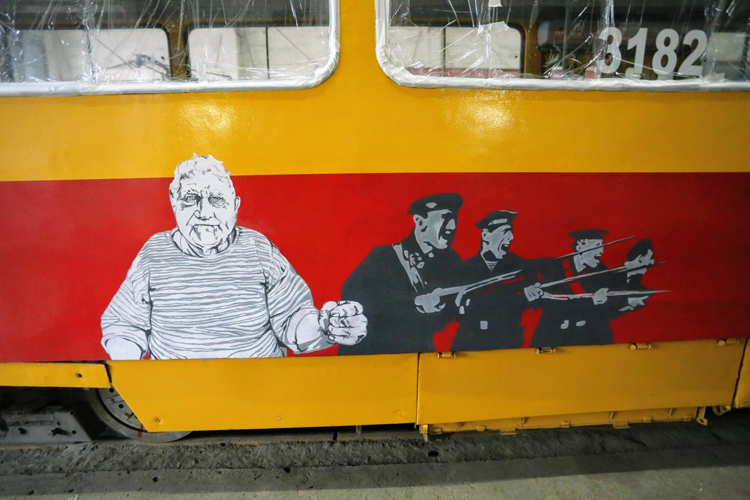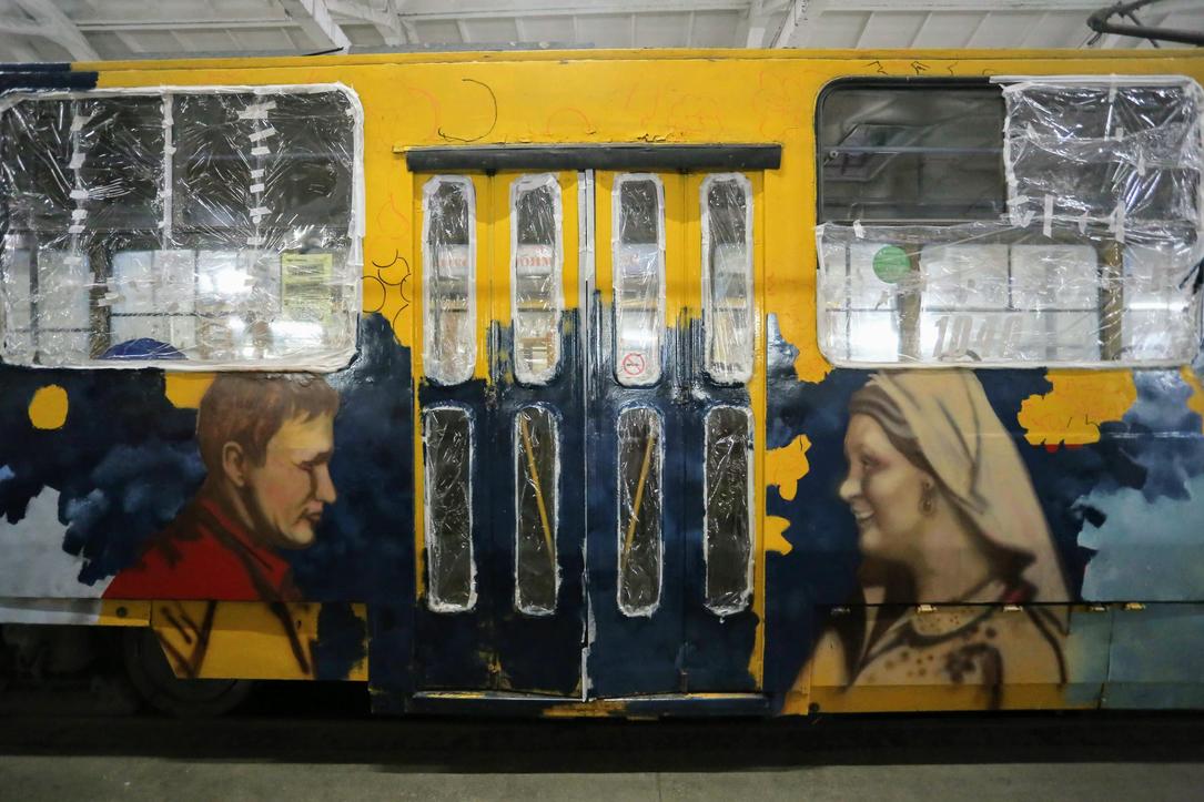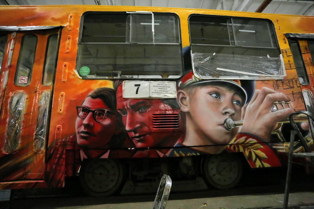 Каждый из пяти трамваев стал полотном со своей уникальной тематикой. Здесь есть и портреты героев войны, и музыкальная тема, и абстракции. У одной команды граффити посвящены фильму Сергея Бондарчука "Они сражались за Родину", где главную роль сыграл Василий Шукшин.